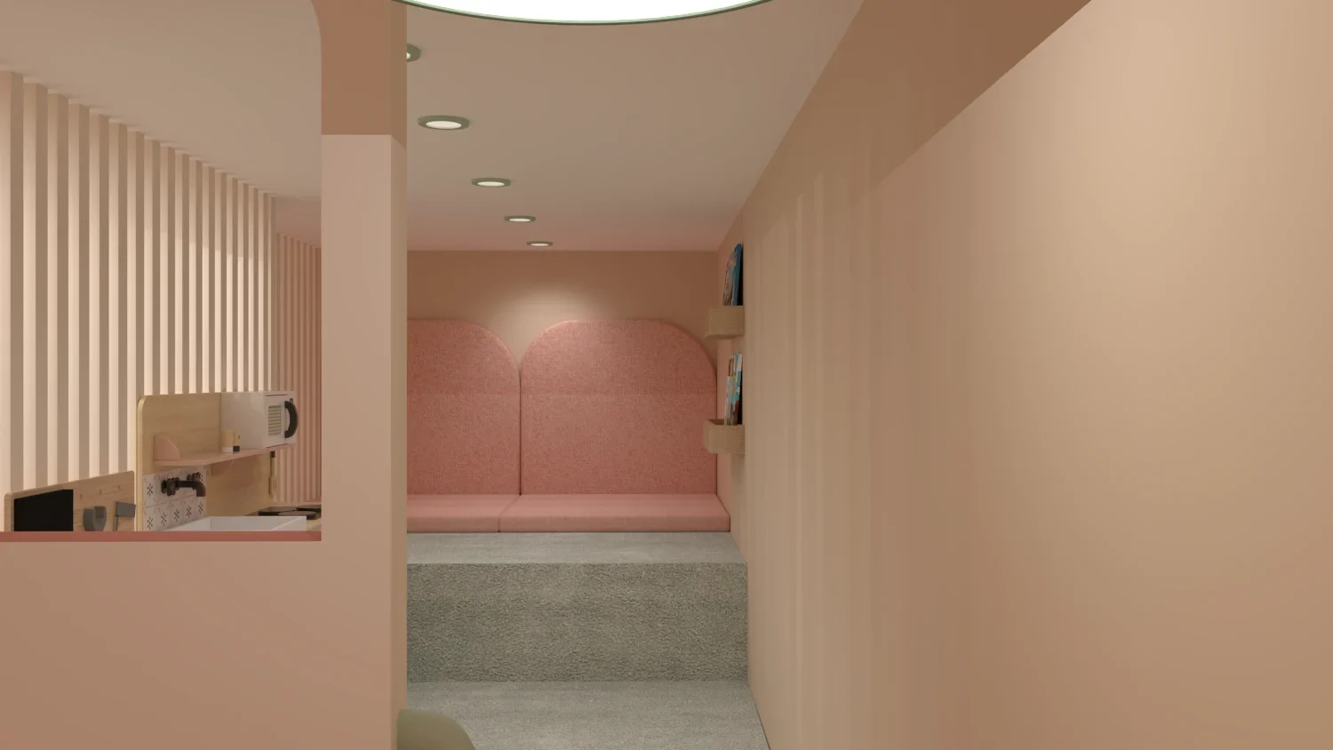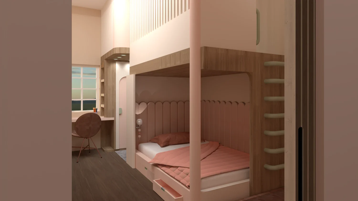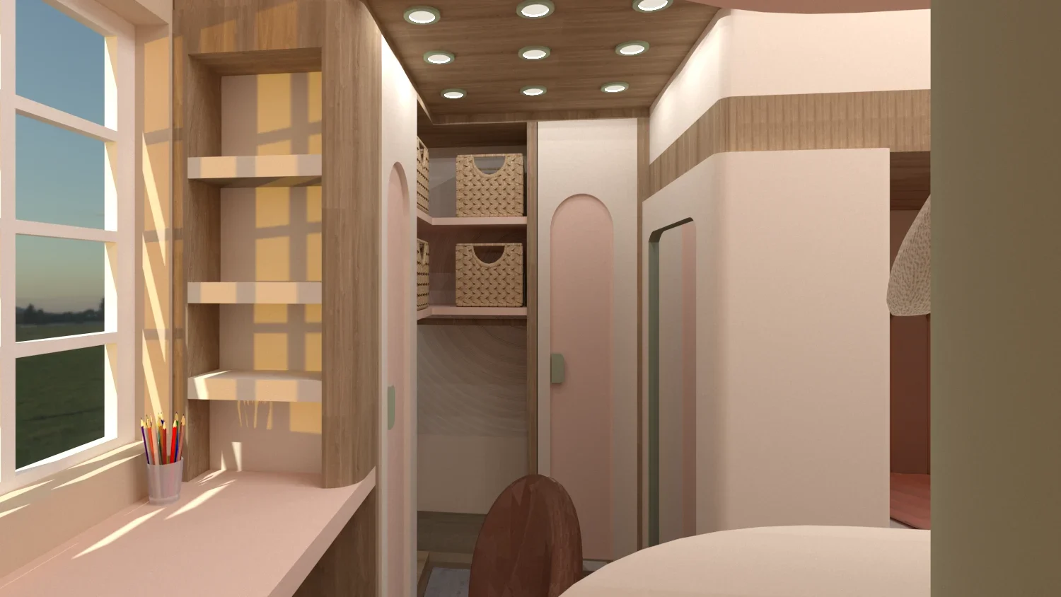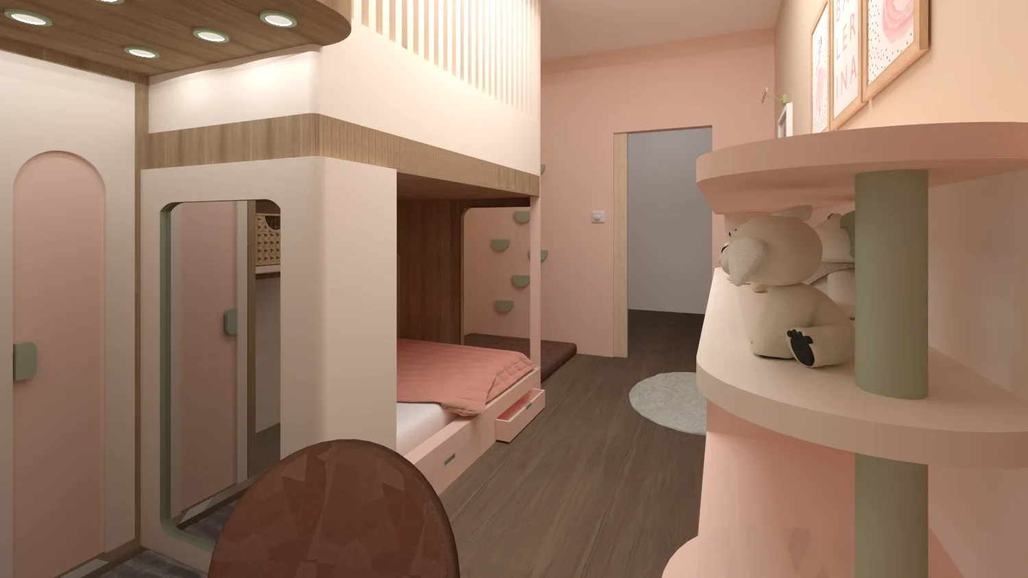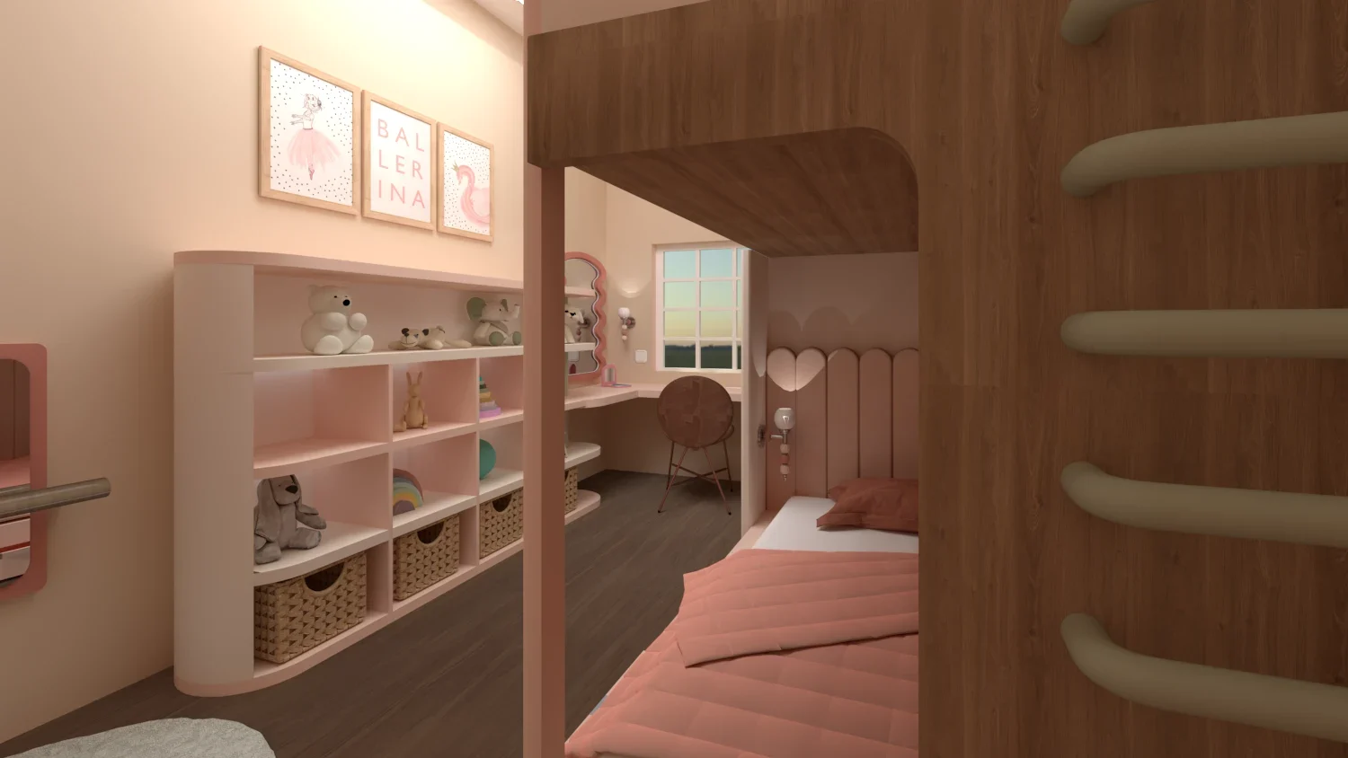 Тази стая съчетава функционалност, движение и вдъхновение. Интериорът е в дърво и пастелни тонове за уют и светлина. Основен акцент е второто ниво над леглото – кът за игра и четене с библиотека и възглавнички. Има стена за катерене и мека възглавница за безопасност. Бюрото плавно преминава в тоалетка, а гардеробът с голямо огледало и кътът за балет допълват пространството. Мебелите осигуряват достатъчно съхранение, а атмосферата е топла и вдъхновяваща – идеална за всяка малка дама.